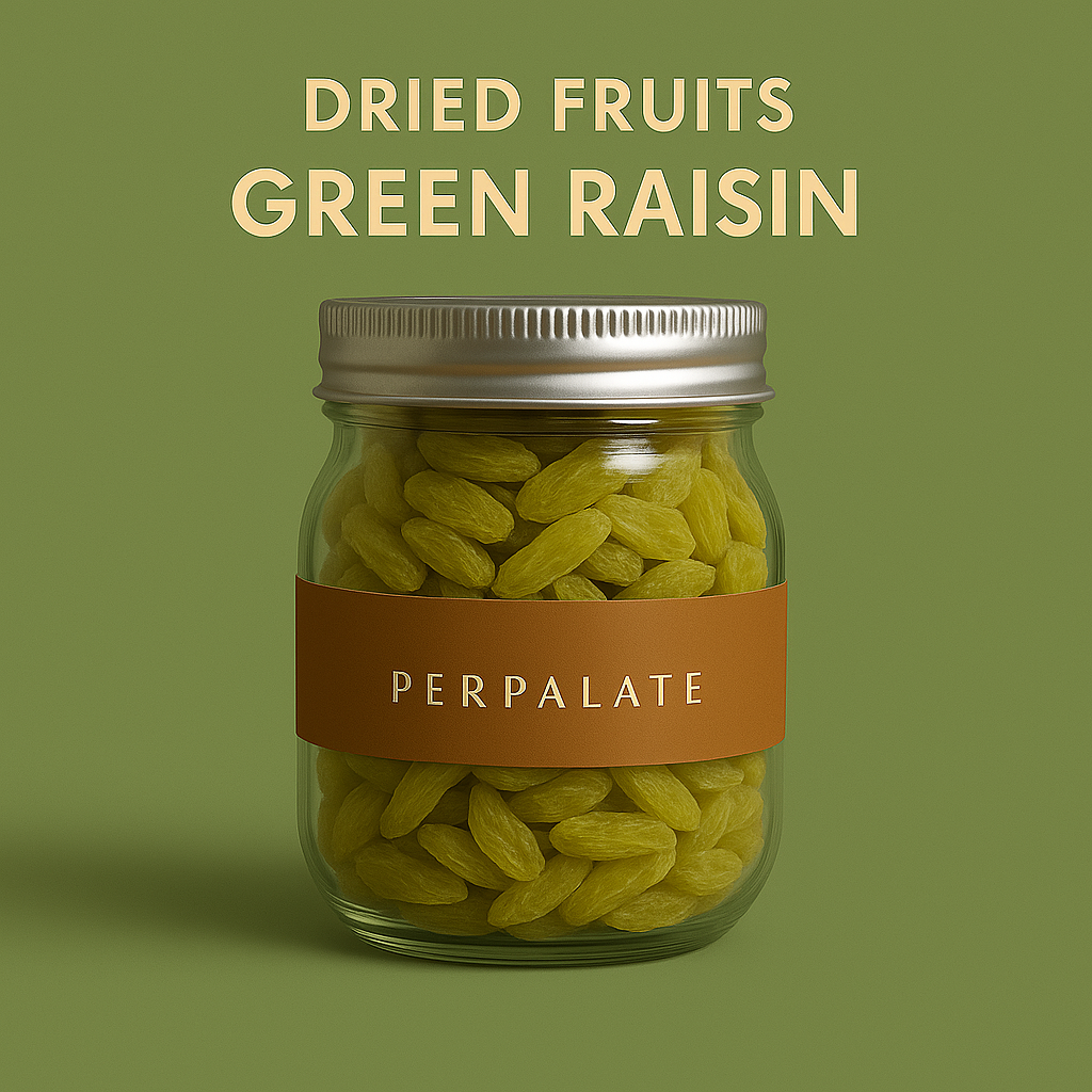 Beautifully packaged in a 300g reusable glass jar with our signature PerPalate label, these green raisins deliver both premium flavor and elegant presentation.